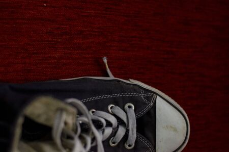 Side view of an old and dirty red sports shoe, made of elona, ​​used and dirty. Old shoe concept, young lifestyle