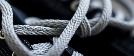 Explore the visual elegance of intricate white shoe lacing, showcasing a unique crossed design set against a dramatic black background.