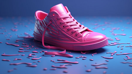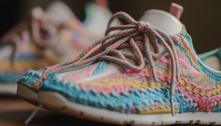 This close-up image captures a colorful sport shoe with intricate braided laces, showcasing vibrant details against a stunning gradient background.