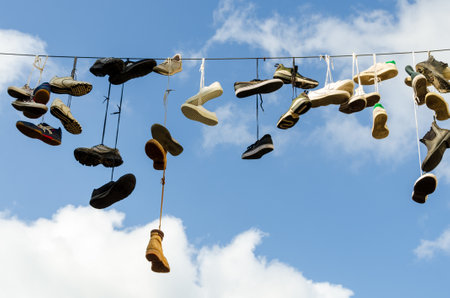 Many old worn boots or shoes hang on an electric cable