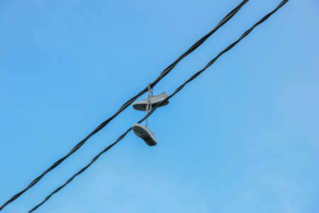 Sports shoes dangling on power cable. Pair of old sneakers hanging on electric wires