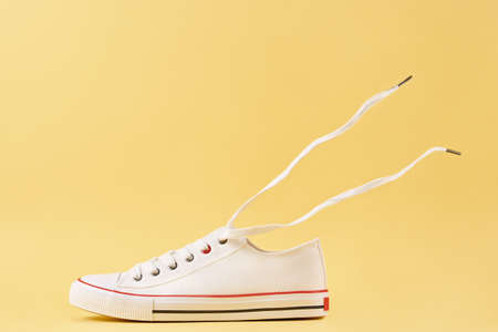 White female sport sneakers with flying shoe lace against yellow background, Casual trendy shoes closeup, Creative minimal design with copy space