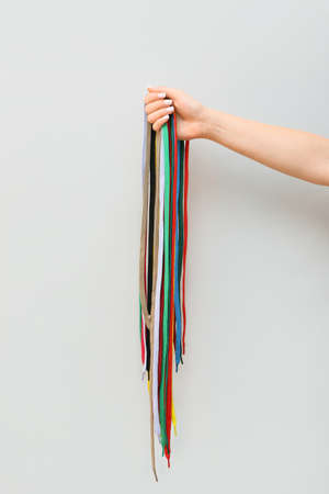 Woman holding many shoe laces on white background, closeup