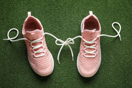Modern pink sport shoes with gray shoelace on natural background.