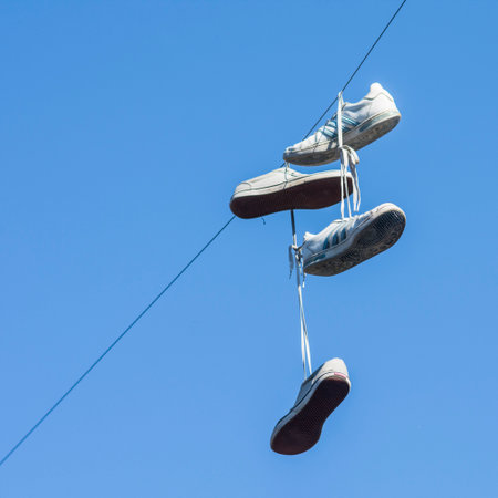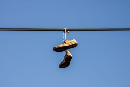 shoes on power lines - urban scene, worn tennis shoes hanging from a power line against clear blue sky. plenty of copyspace.