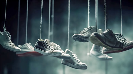 Ljubljana, Slovenia - August 15, 2024: Shoes hanging on wires in the Metelkova area of Ljubljana, a symbol of alternative culture and urban expression