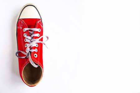 red sneaker with lacing on white background, closeup, top view, copy space
