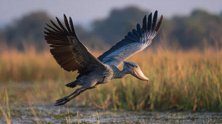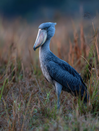 A shoebill stork stands quietly amidst tall grass, its striking plumage illuminated by soft moody lighting that enhances its impressive profile