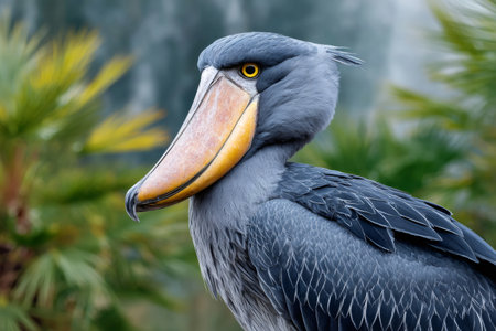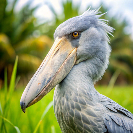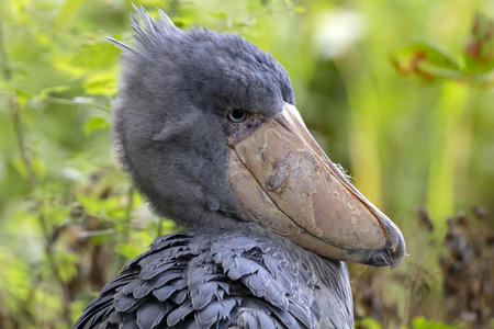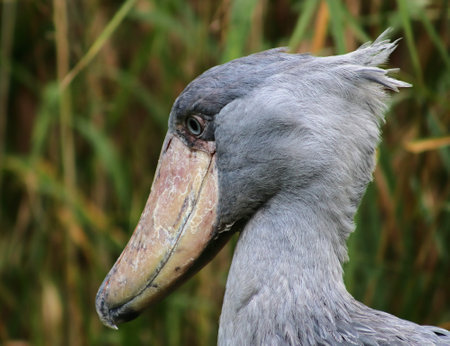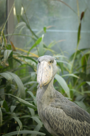 Shoebill bird close-up portrait standing outdoors with a green natural background