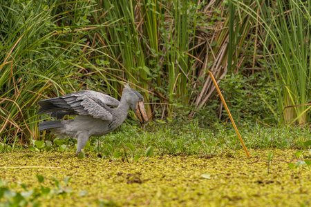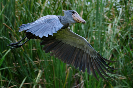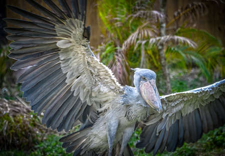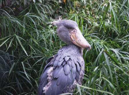 Rare Shoebill bird with a big beak in the wild green African jungles. Stork family, animals in the wild