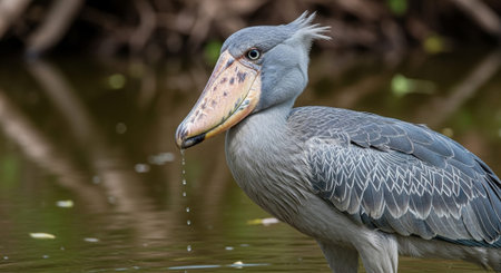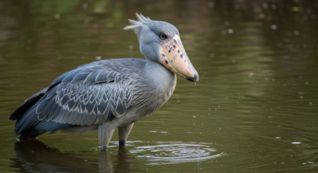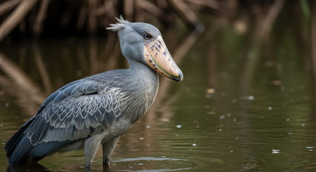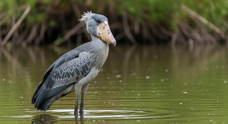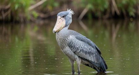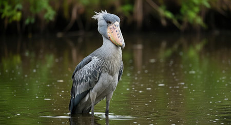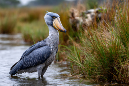 Shoebill bird standing by a tranquil wetland with tall grass, reflecting wildlife in nature