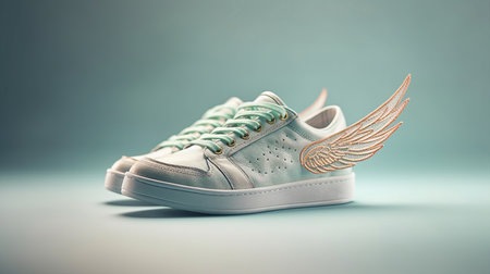 Stylish white flying sneakers, advertising concept. Al generated illustration