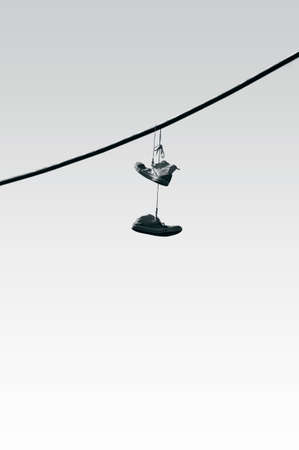 Ljubljana, Slovenia - August 15, 2024: Shoes hanging on wires in the Metelkova area of Ljubljana, a symbol of alternative culture and urban expression