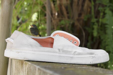 Color footwear hangs against the background. Advertising of footwear on the street. Pile of assorted footwear abstract background. Shoe drying