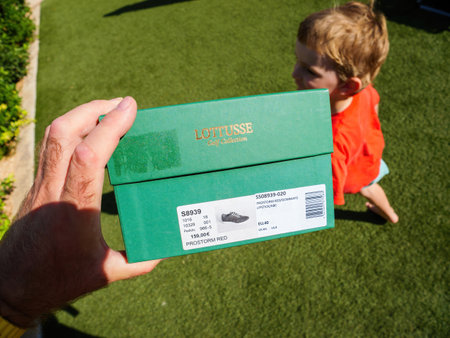 Palma, Spain - Jul 11, 2024: From a point-of-view perspective, a male hand holds a cardboard box with the Lotusse Golf Collection Prostorm red shoes, priced at 159 euros, with a todlerwalking in the background
