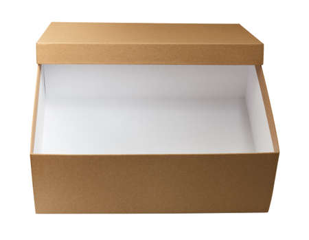 Open box made of brown cardboard on a light background. Empty box for packaging and delivery of goods low with copy space