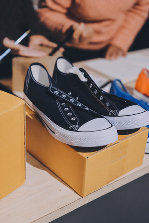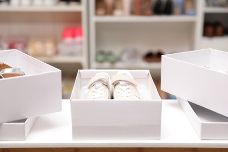 Shoeboxes standing on a shelf in a shoe store. Cardboard boxes on rows of shelves in distribution warehouse. Shoe distribution or delivery warehouse, logistics warehouse dispatch of goods