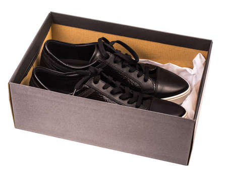 Men shoes in an open box, isolated on a black background. Open Shoe box. New shoes from the store. Brown shoes made of genuine leather. The view from the top
