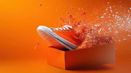 A vibrant orange sneaker bursts from its box, sending a colorful splash of powder into the air against a striking orange backdrop, symbolizing energy and creativity.