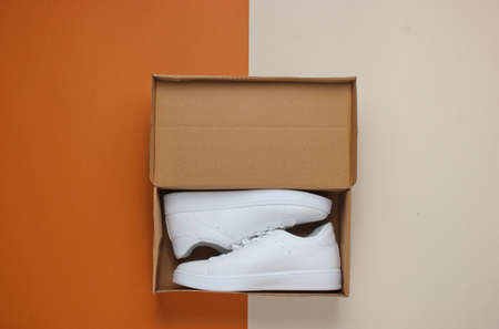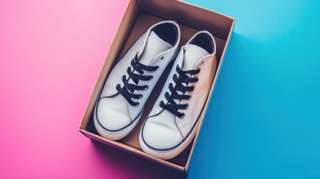 This image features a pair of stylish white sneakers with black laces neatly placed in a brown cardboard box against a vibrant pink and blue background. Perfect for fashion and lifestyle presentations.