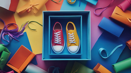 Two colorful sneakers in a blue gift box sit atop vibrant wrapping paper and ribbons, creating a joyful scene perfect for celebrations or marketing.