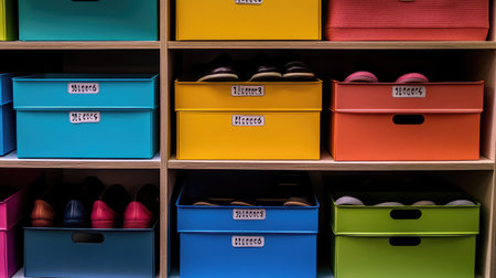 A stack of colorful shoeboxes on a shelf, each box labeled with different shoe sizes.