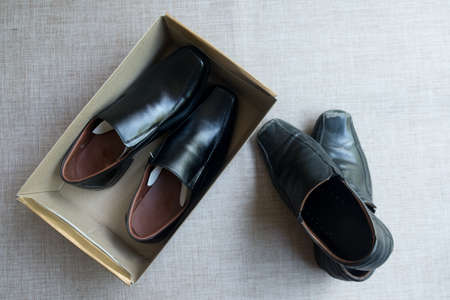 Pair of new black leather shoes inside a box and pair old black leather shoes outside box