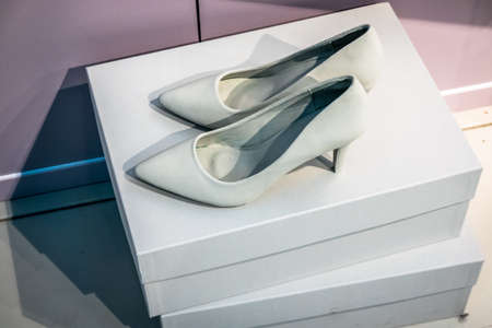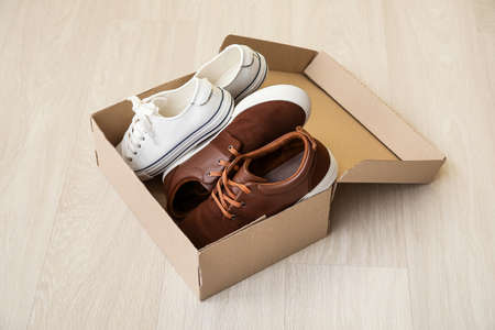 New leather heeled shoes with a cardboard box on the floor. Top view