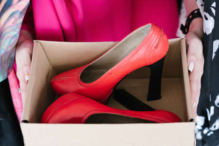 fashion footwear and shoes. personal style and popular trends. self expression and creativity. woman hands holding red leather high heel stylish shoes in a box.