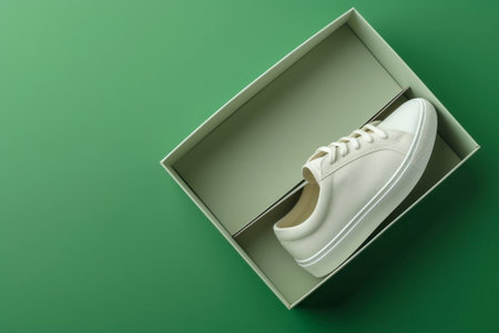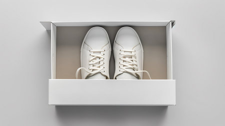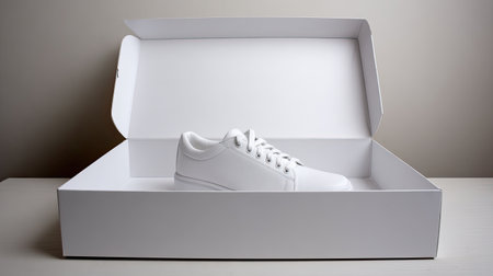 A stylish white sneaker elegantly showcased in a minimalist packaging, perfect for illustrating modern footwear trends in a clean, professional setting.