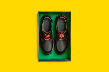 Stylish black leather shoes in a box on yellow background, flat lay, top view