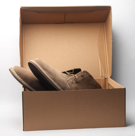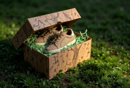 Shoes in Box on Grass. Brown leather shoes in a cardboard box with grass-like packing material, placed on green grass.