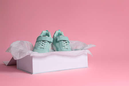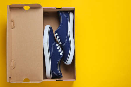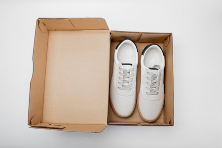 A studio shot of pair of running shoes in paper box. Flat lay.