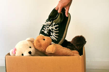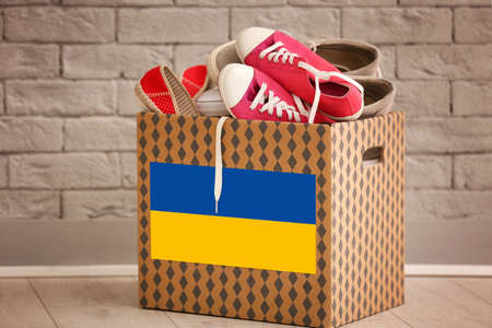 Humanitarian aid for Ukrainian refugees. Donation box with shoes on floor near brick wall