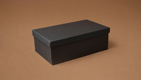 Closed black cardboard box on a brown background. Premium photo mockup for elegant and clean cardboard box product.