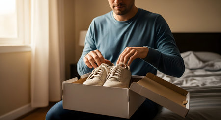 A man sits on the edge of a bed, opening a cardboard box to reveal a pair of new white leather sneakers. The image captures the excitement of unboxing a purchase and checking out new footwear at home.