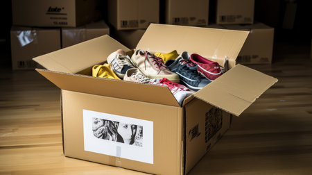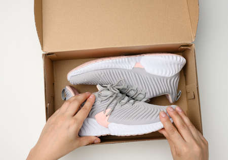 two female hands are holding a brown cardboard box with gray sports sneakers on a white table, inspecting an online order