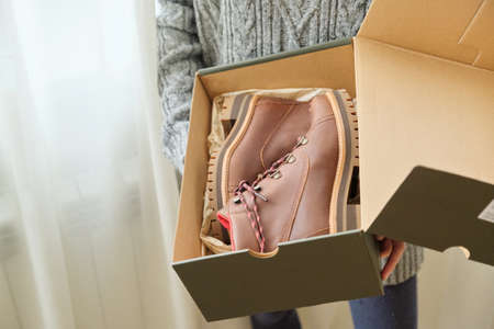 New womens leather brown waterproof hiking winter autumn boots in hands of female, trendy footwear for winter. Unpacking shoes, shopping online from home, shoe fashion store