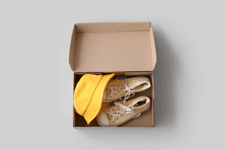 Pair of sneakers in a shop box on a gray background. Space for text. Top view.