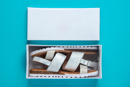 A stylish pair of elegant white shoes sits atop an open blue box, set against a minimalistic backdrop, perfect for showcasing modern fashion and lifestyle themes.