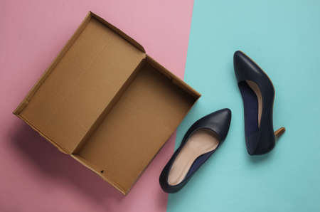 New leather shoes with a cardboard box on a blue-pink pastel background. Gift for woman. Top view