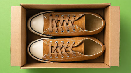 A pair of stylish brown sneakers neatly placed inside a brown box, set against a bright green background, ideal for fashion marketing or product display.
