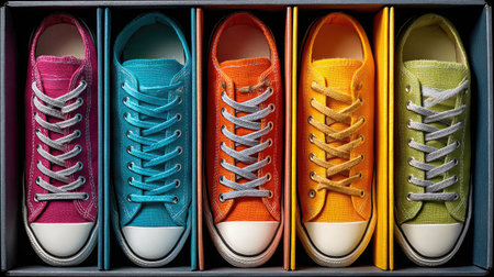 A vibrant collection of colorful sneakers displayed in a box showcases shades of blue, pink, orange, yellow, and green. These trendy shoes highlight youthful fashion and modern style.