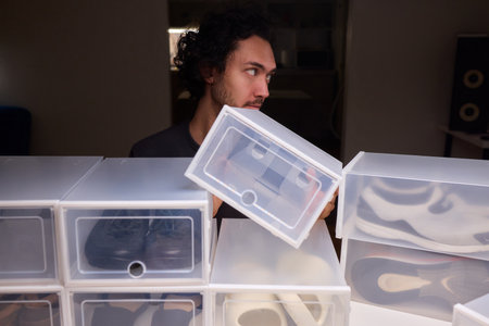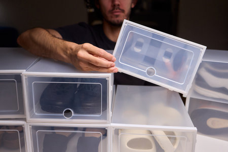 Organizing clear shoe containers effectively, Arranging transparent footwear storage with focus and style, Meticulous placement of feedthrough shoe boxes in minimalist
