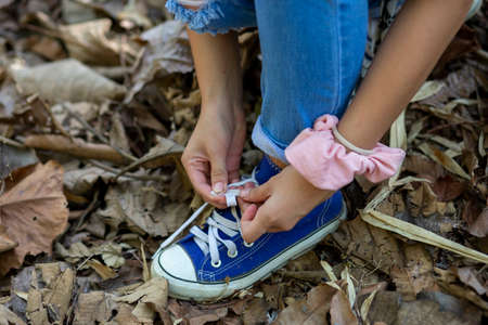 Close up of a woman tying the laces of her brightly colored sneakers, preparing for a walk or other activity