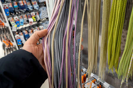 Multicolored shoelaces on a hypermarket. Sale of new shoes