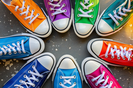Bright and vibrant sneakers with rainbow colors placed on a textured carpet, evoking feelings of joy, creativity, and individuality in a lively and playful atmosphere.