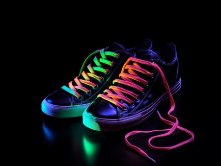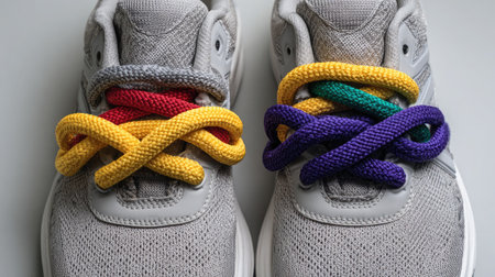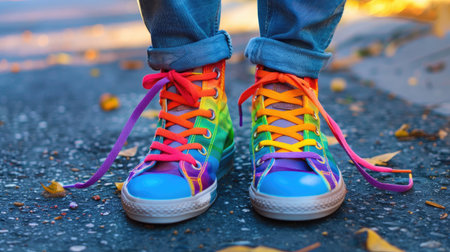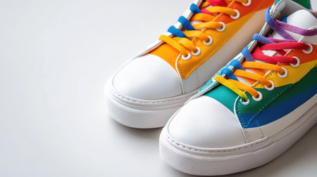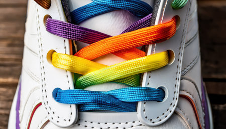 Colorful rainbow shoelaces wrap around a sneaker, celebrating pride and inclusivity in style.