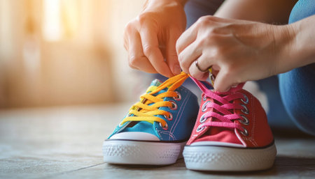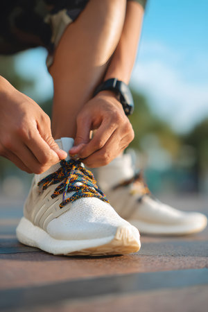 A close-up shot captures the hands of a person tying their shoelaces on a pair of sneakers. The scene suggests preparation for an outdoor workout or run, the shot conveys focus, readiness and the healthy lifestyle habits.