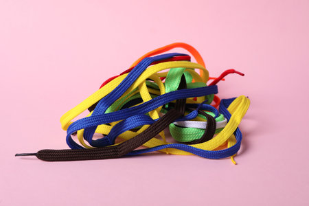 Many colorful shoe laces on light pink background